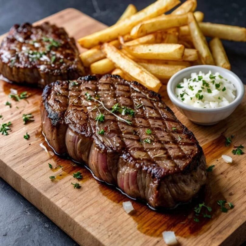 Looking for a delicious and filling dinner? Try this Ribeye Steak with French onions and French fries, packed with rich flavors.